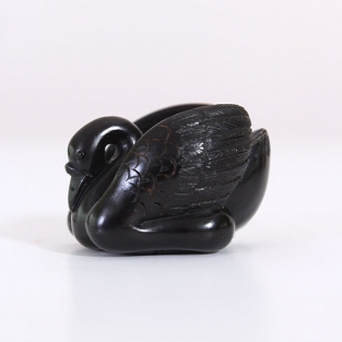 De zwaan is mooi vormgegeven in deze netsuke, zelfs de poten zijn uitgesneden, ook is op de vleugels de verentooi goed te zien. Hij is nieuw gemaakt van ijzerhout en voorzien van het stempel van de maker.