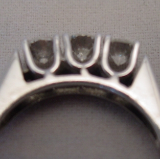 De drie briljanten wegen samen 0,80 carat. De kleur is Wesselton, de kwaliteit is VS.